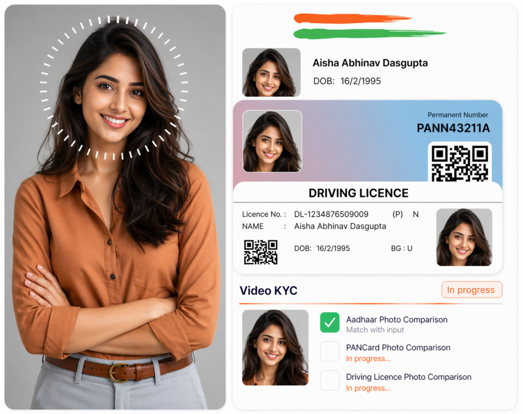 Supports digitisation of the ID.High-accuracy AI-driven OCR to read and match ID card information.All valid formats supported: Aadhaar, PAN, Passport, Driving Licence, Voter ID,and Bank Verification. -
