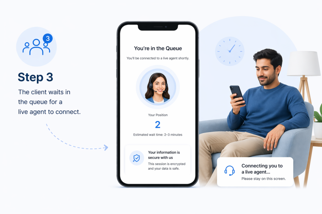 The client waits in the queue for a live agent to connect.