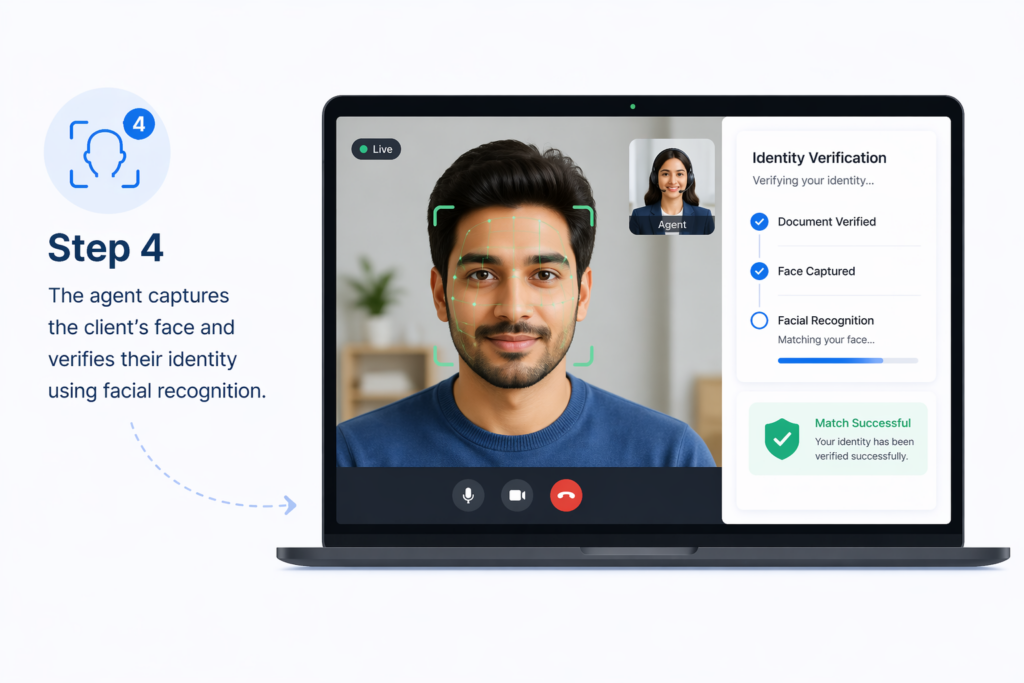 The agent captures the client’s face and verifies their identity using facial recognition.