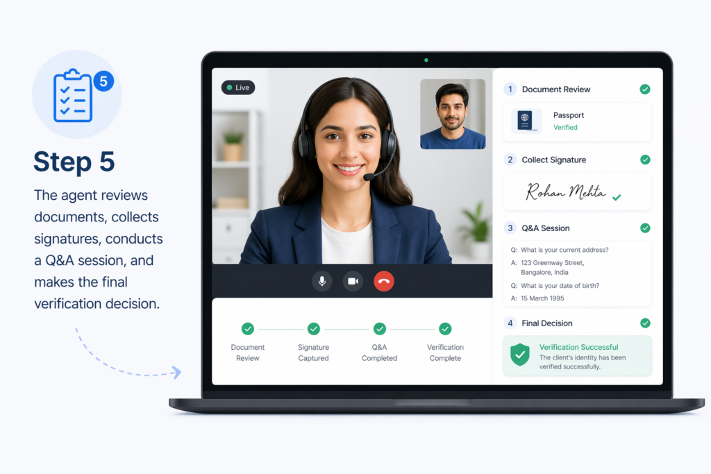 The agent reviews documents, collects signatures, conducts a Q&A session, and makes the final verification decision.
