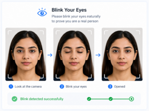 Customer is asked to blink during the video flow. AI detects natural eye movement to confirm live presence. -